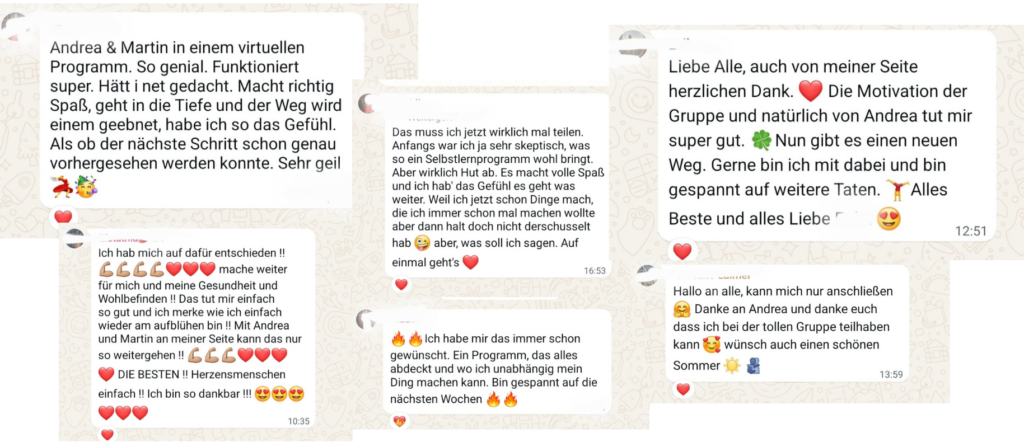 Du wirst durch wöchentliche Live-Impulse mit Andrea & Martin begleitet, erhältst praxisnahe Inhalte und wirst dabei unterstützt, die nächsten Schritte sicher und selbstbestimmt umzusetzen – ohne Leistungsdruck oder Kontrolle.